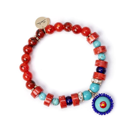 Uno straordinario bracciale elastico che dona un tocco vivace e trendy. Design con luminoso filo di boule che incontra un segmento di luccicanti cerchietti e arricchito da un grazioso charm artistico pendente dalle nuances vibranti. Un accessorio dallaccento mediterraneo nelle sue cromie multicolore e oro, perfetto con qualsiasi outfit. Targhetta Sodini come pendente. - Ogni pezzo è realizzato a mano e presenta caratteristiche uniche, pertanto possono essere presenti variazioni fra articoli analoghi.