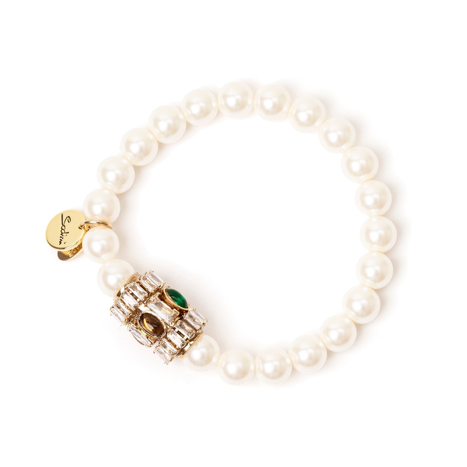Questo bracciale elastico è il complemento ideale se desideri essere elegante e alla moda. Design luminosissimo con un filo di candide perle che incontra un brillantissimo charm a cilindretto dalle nuances che incantano. Un accessorio perfetto per un look impegnato o per quando vuoi tu, nelle sue cromie multicolore e oro. Targhetta Sodini come pendente.