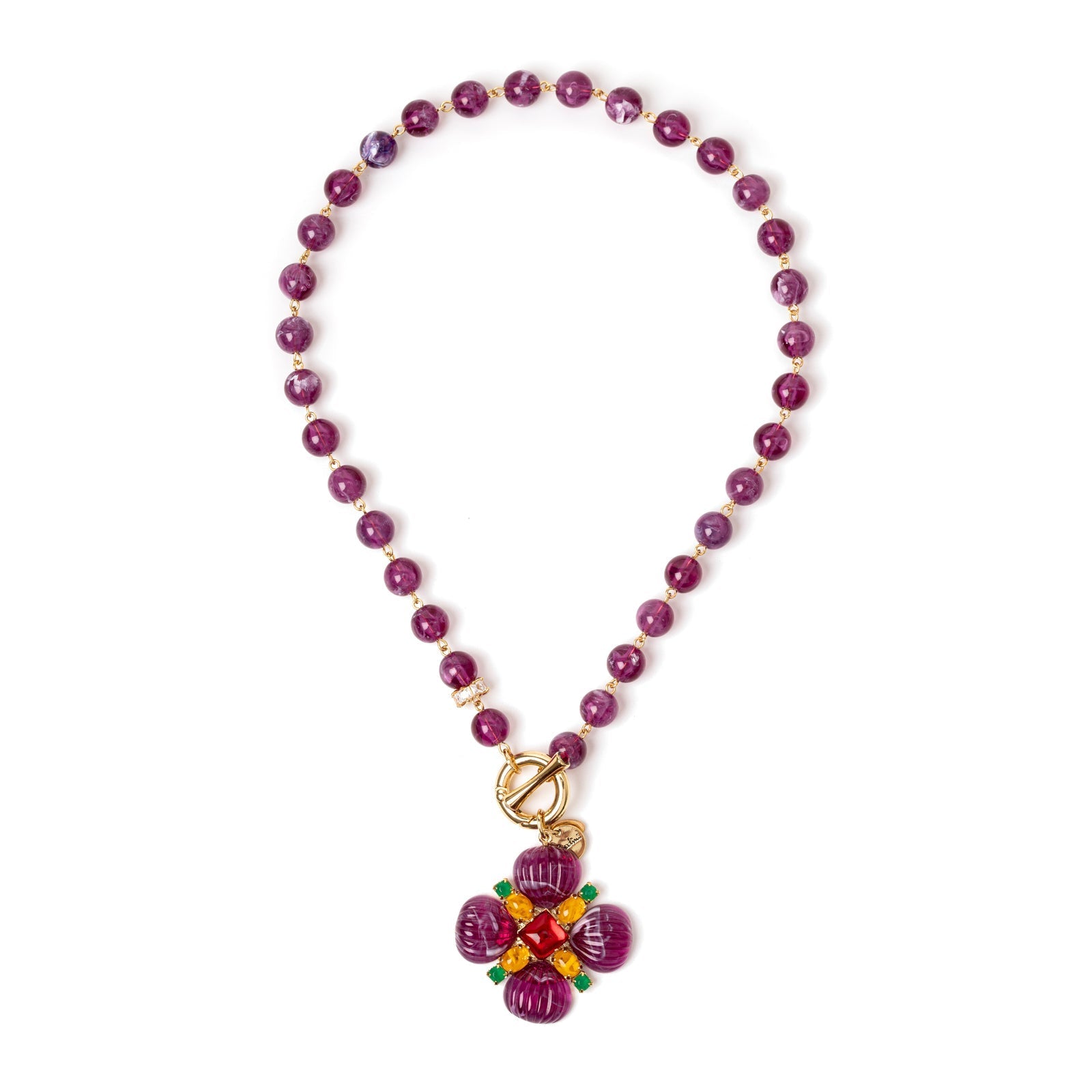 Rendi speciale il tuo outfit con questa originalissima collana, raffinata e alla moda. Design carismatico con un filo di lucidissime boule ad effetto sfumato ed un opulento pendente a fiore dalle nuances lussureggianti, per un unicum fresco e luminoso. Un accessorio perfetto in qualunque occasione, in una versione del viola, topazio, verde, rosso e oro. Targhetta Sodini sul pendente.