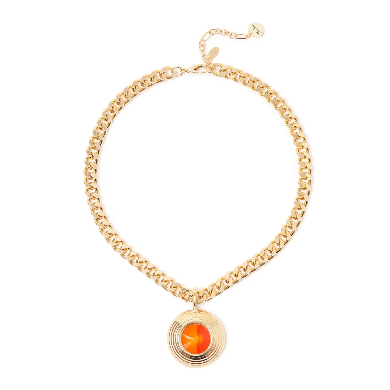 Aggiungi alla tua mise una collana corta che mette in luce il tuo stile brioso. Design unico con scintillante catena groumette impreziosita da accattivante pendente a cupola dalle linee concentriche e cristallo centrale che regala splendidi effetti cromatici al tuo look. Un accessorio perfetto in qualsiasi occasione, in una versione dalle cromie dell'arancio e oro. Targhetta Sodini sull'estensione.
