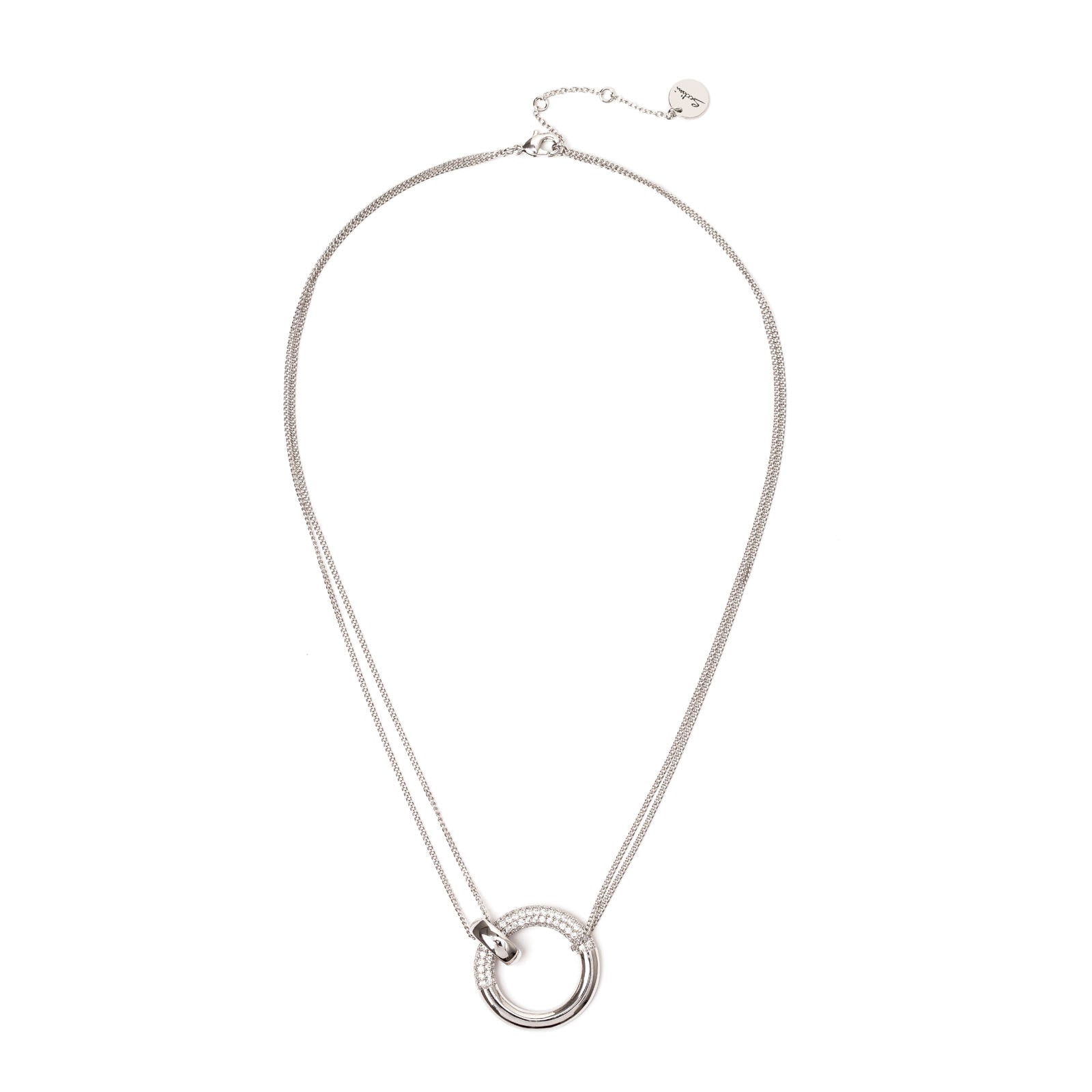 Questa collana corta è il dettaglio ideale per donare finesse in tutte le occasioni. Design luminoso con splendente catena a doppio filo che incontra al centro un anellino ed un cerchio impreziositi da pavè di brillanti mini zirconi che portano splendore al decollete. Un accessorio in una versione dai toni del cristallo e rodio, perfetto per non passare inosservata. Targhetta Sodini sulla catenina di estensione.