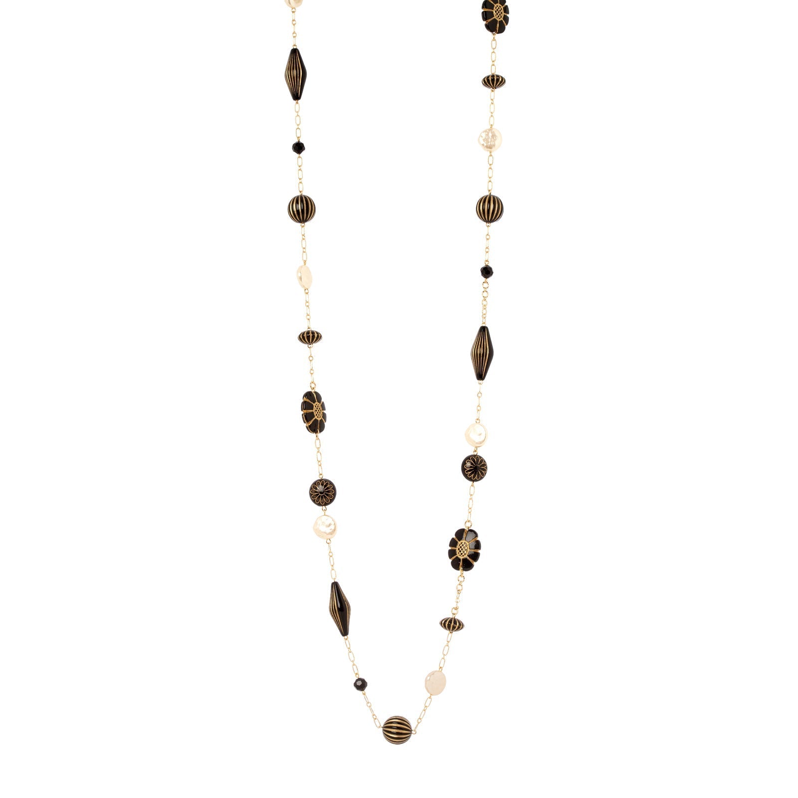 Accattivante e assolutamente fashion questa collana extra lunga aggiunge un tocco di moderna eleganza su qualsiasi outfit. Design originale con delicata catena che incorpora una serie di incantevoli elementi dalle nuances a contrasto accanto a alcune perle barocche. Un accessorio perfetto per un look impegnato o per quando vuoi tu, nelle sue cromie del nero, cristallo e oro. Targhetta Sodini sulla chiusura.