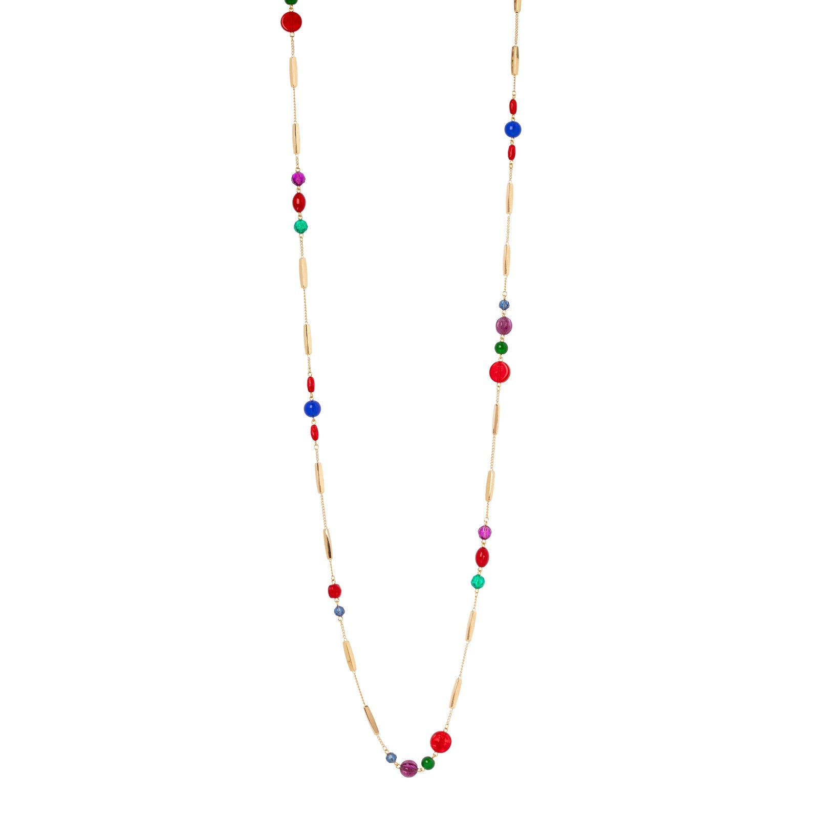Rendi unico il tuo outfit con questa originalissima collana lunga, stilosa e alla moda. Design carismatico con splendente sottile catena che ospita una serie di aurei elementi tubolari accanto a cromatiche piccole boule e bonbon dalle nuances armoniose, per un unicum fresco e luminoso. Un accessorio perfetto in qualunque occasione, nelle sue cromie multicolore e oro. Con targhetta Sodini.