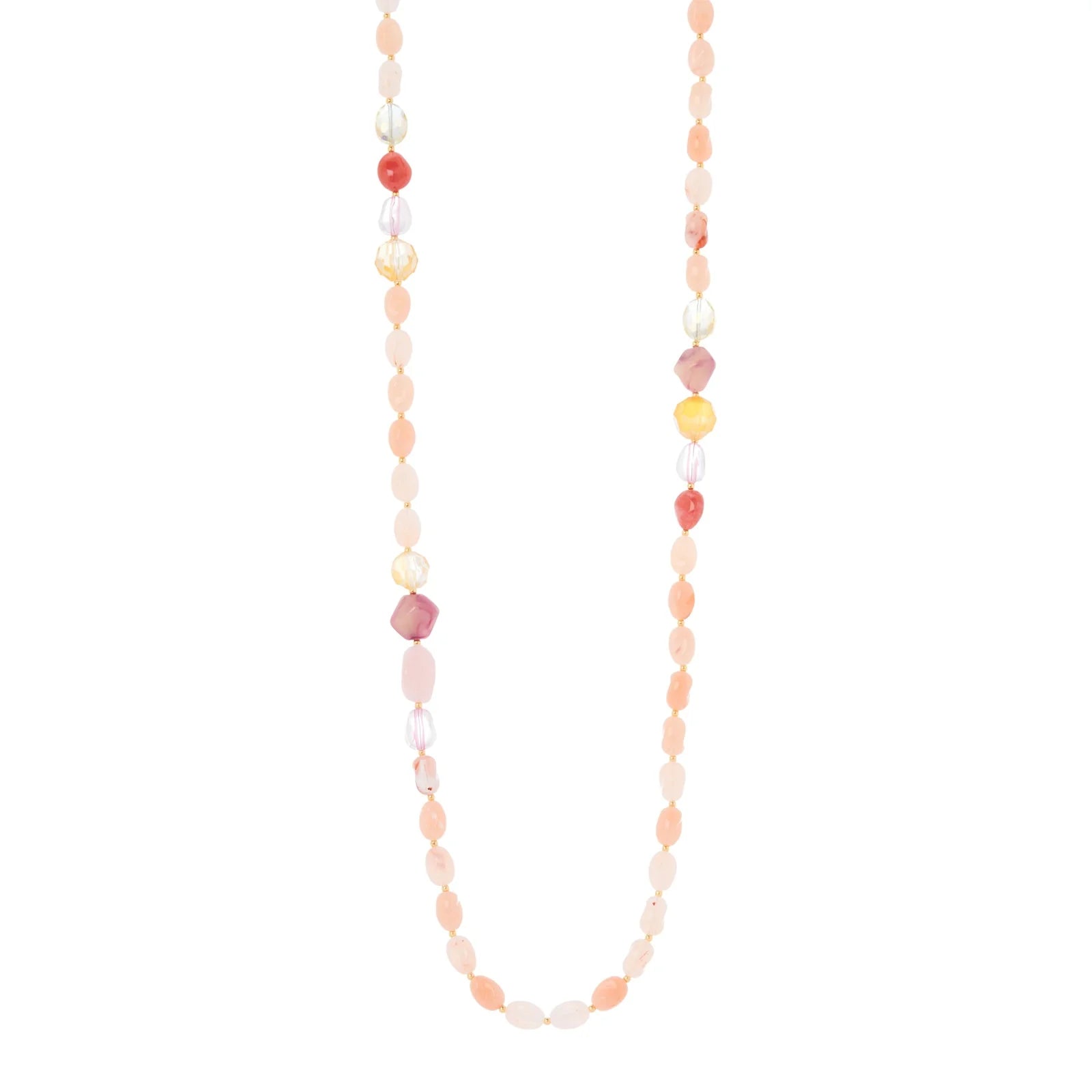 Aggiungi alla tua mise una collana lunga che mette in luce il tuo stile raffinatissimo. Design luminoso con un filo di lucide bonbon e sassolini separati da piccole sfere dalle nuances invitanti, per un unicum che impreziosisce il look. Un accessorio perfetto in qualunque occasione, nelle sue accattivanti cromie del rosa e oro. Targhetta Sodini sulla chiusura.