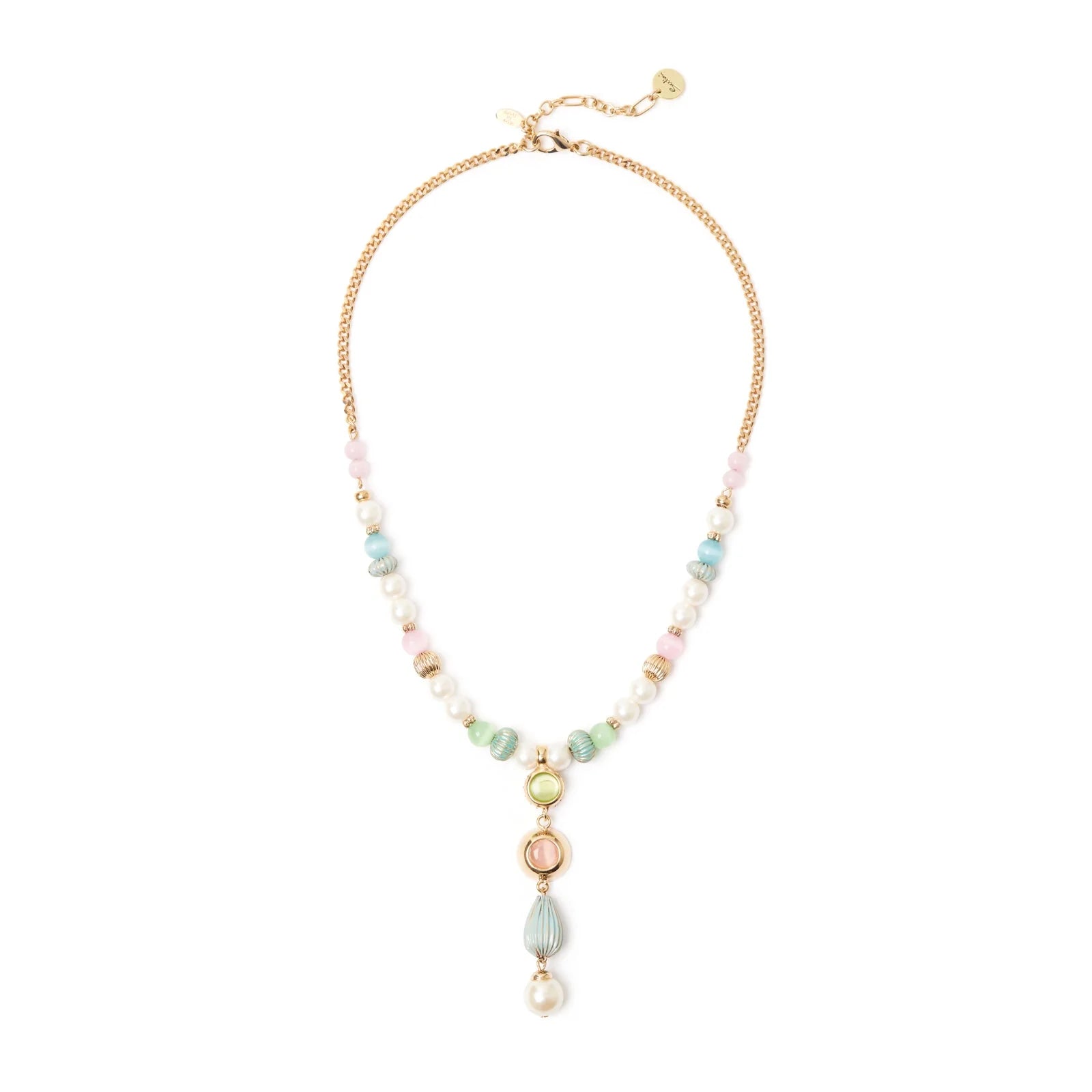 Accattivante e di charme questa collana aggiunge un tocco prezioso su qualsiasi mise. Design a Y con splendente catena groumette che prosegue con luminoso filo composto da perle, cromatiche boule, squisiti elementi rigati e lucidi cabochon. Un accessorio perfetto in qualunque occasione, nelle sue cromie multicolore e oro. Targhetta Sodini sullestensione.