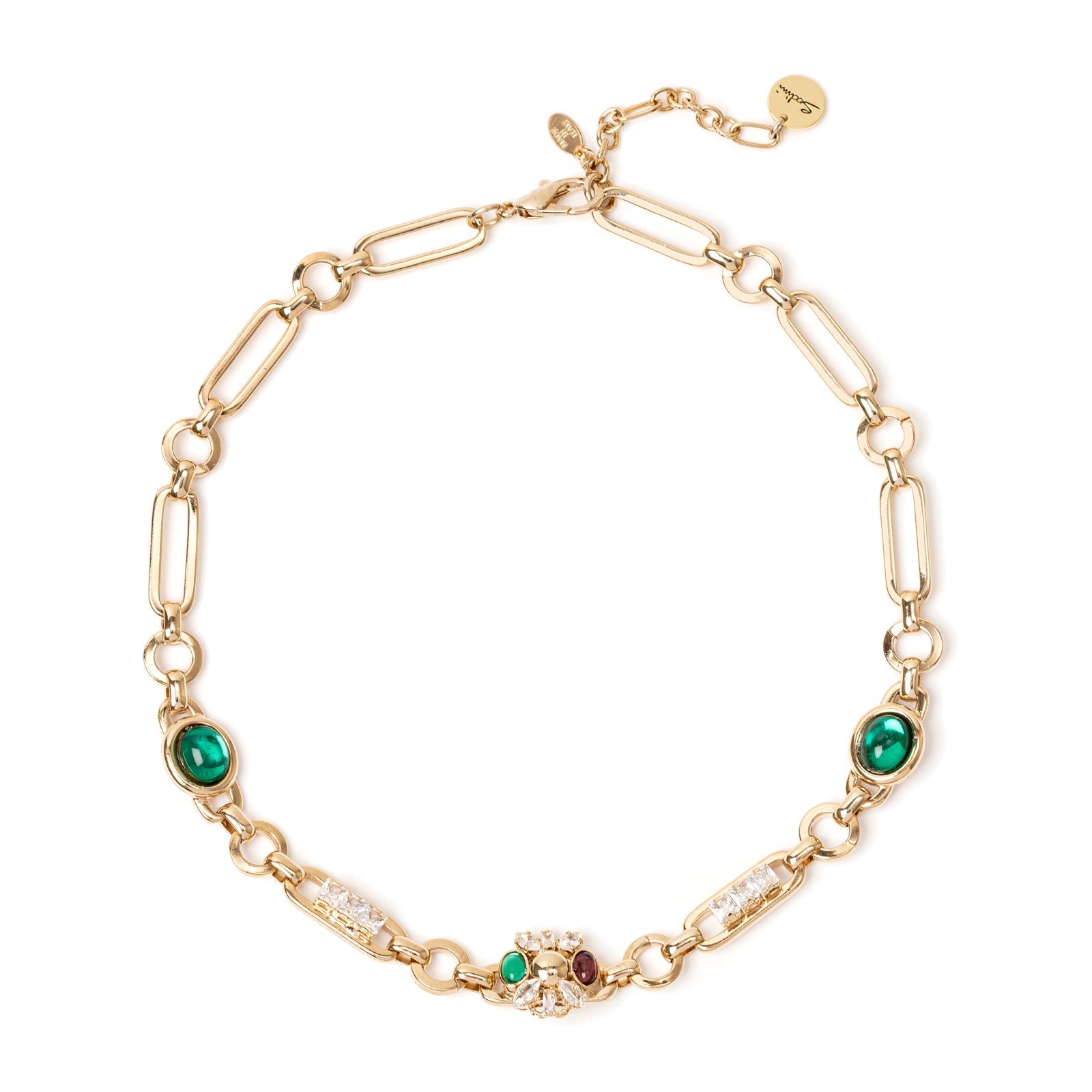 Radioso e sofisticato questo girocollo aggiunge un tocco di fresca eleganza su qualsiasi mise. Design luminosissimo con splendente catena che incorpora due cromatici cabochon, brillanti strass ed uno scintillante charm dai riflessi inebrianti. Un accessorio perfetto per un look impegnato o per quando vuoi tu, nelle sue cromie multicolore e oro. Targhetta Sodini sullestensione.