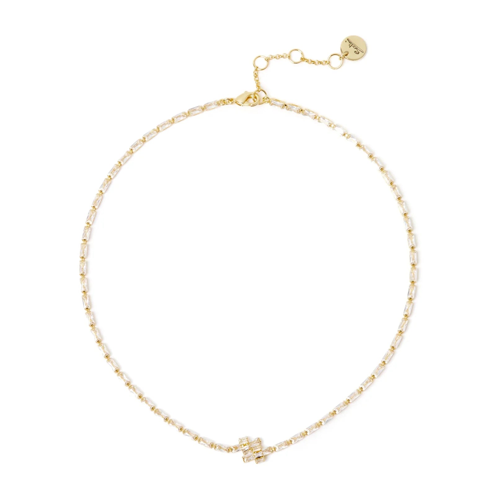 Un girocollo dal fascino che ti contraddistingue in uno stile luminoso e senza tempo. Design con splendente filo di abbaglianti zirconi baguette che al centro formano un brillante elemento geometrico aggiungendo splendore al tuo outfit. Un accessorio prezioso in una versione dalle cromie del cristallo e oro, per un look che non passa inosservato. Con targhetta Sodini sull'estensione.