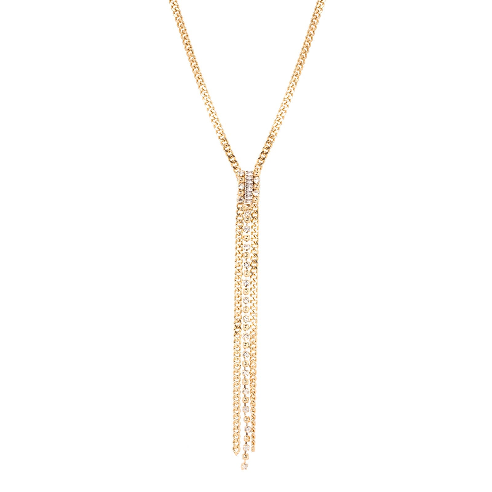 Un girocollo per essere assolutamente elegante e affascinare con originalità. Design con splendente catena groumette che converge al centro su brillante charm che sorregge un pendente con due fili a catena ed uno di strass e mini boule dalle nuances preziose. Un accessorio perfetto per occasioni speciali o quando vuoi tu, nelle sue cromie del bianco trasparente e oro. Targhetta Sodini sulla catenina di estensione.