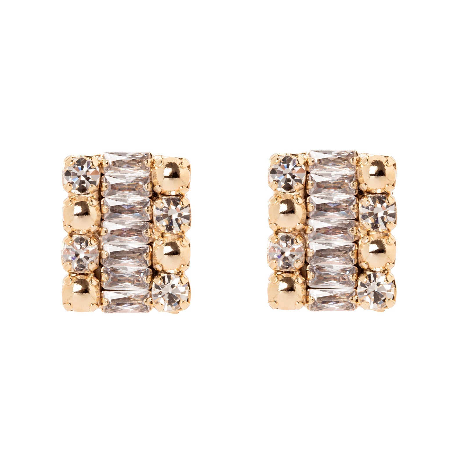 Un paio di orecchini alla moda e super-chic, per chi ama adornarsi con dettagli unici. Design a rettangolo con una linea di brillanti cristalli navette tra due segmenti di mini-boule e strass dalle pregiate nuances che insieme illuminano il viso. Una coppia di accessori perfetti con qualsiasi outfit, nelle loro cromie del bianco trasparente e oro. Logo Sodini sul retro.
