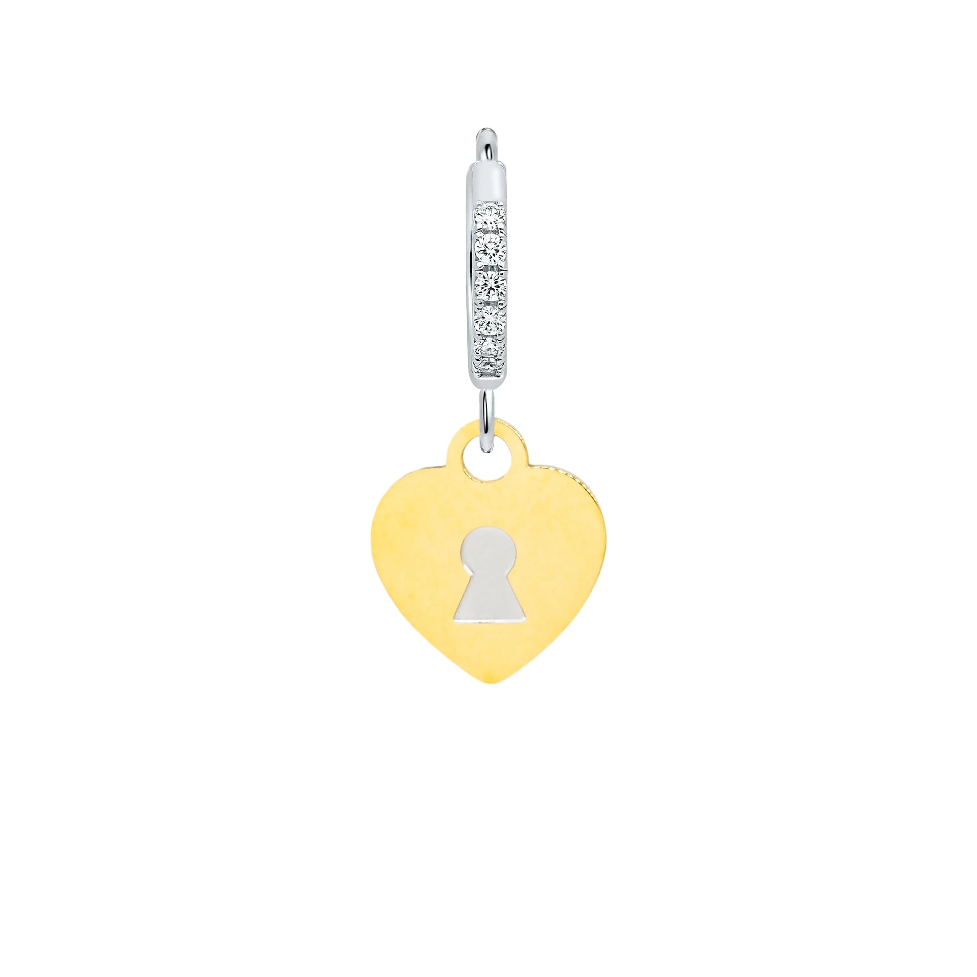 Orecchini a cerchio con cristalli e chiusura a scattino con piccola serratura a forma di cuore e chiave pendente.