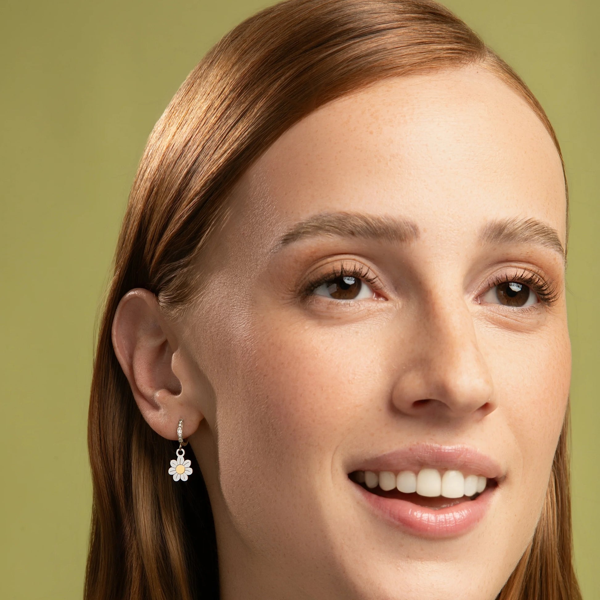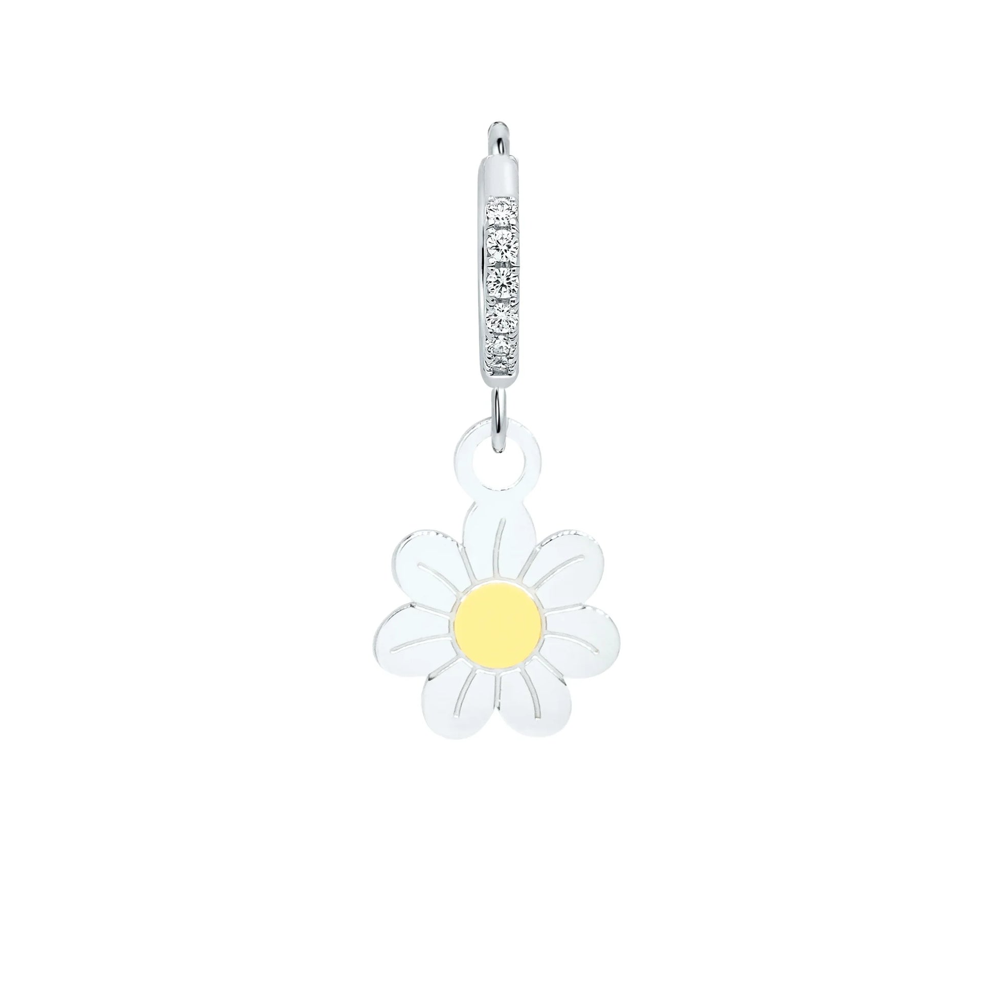 Orecchini a cerchio con cristalli con piccola margherita e Farfalla pendente. Chiusura a scattino.