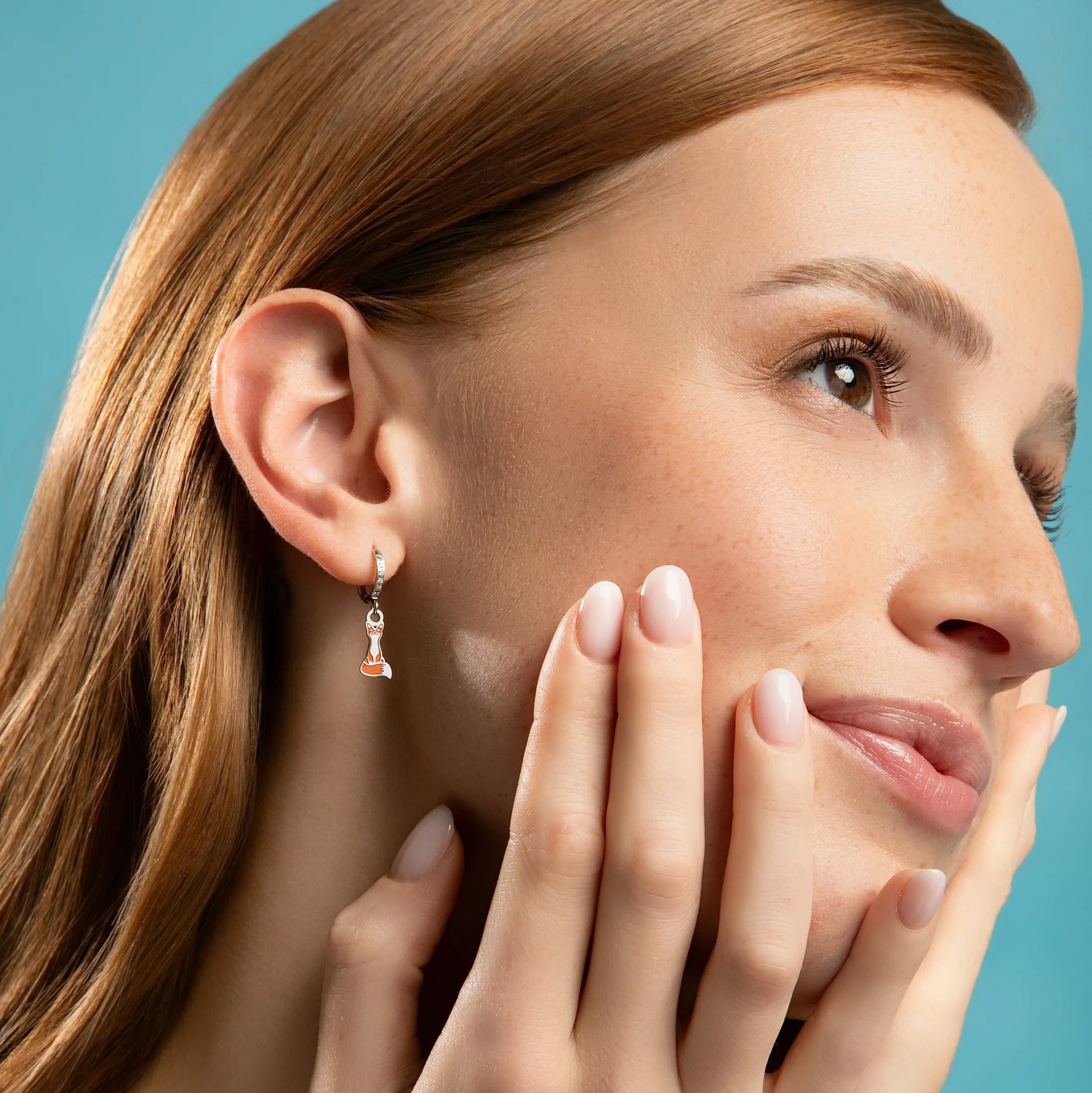 Orecchini a cerchio con cristalli con piccola volpe e rosa pendente. Chiusura a scattino.