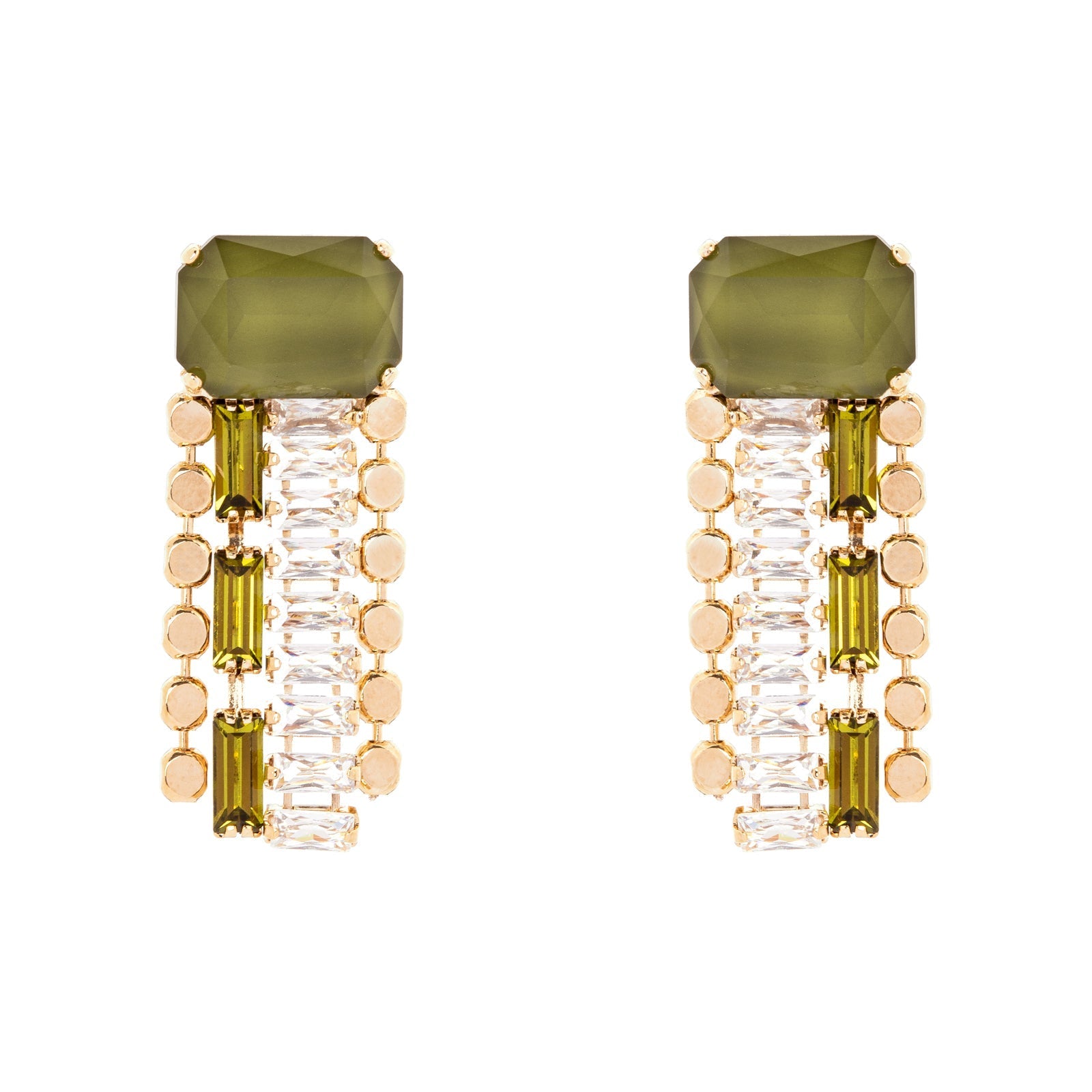Questi stupendi orecchini sono il must-have ideale per un look sontuoso e affascinante allo stesso tempo. Design luminosissimo con un cromatico cristallo che sorregge una breve frangia a due catene e due fili centrali con brillanti cristalli e zirconi piccoli cristalli che illuminano il viso. Una coppia di accessori perfetti per un occasione speciale o per quando vuoi tu, in una versione dalle cromie dellolivina e oro. Logo Sodini sul retro.