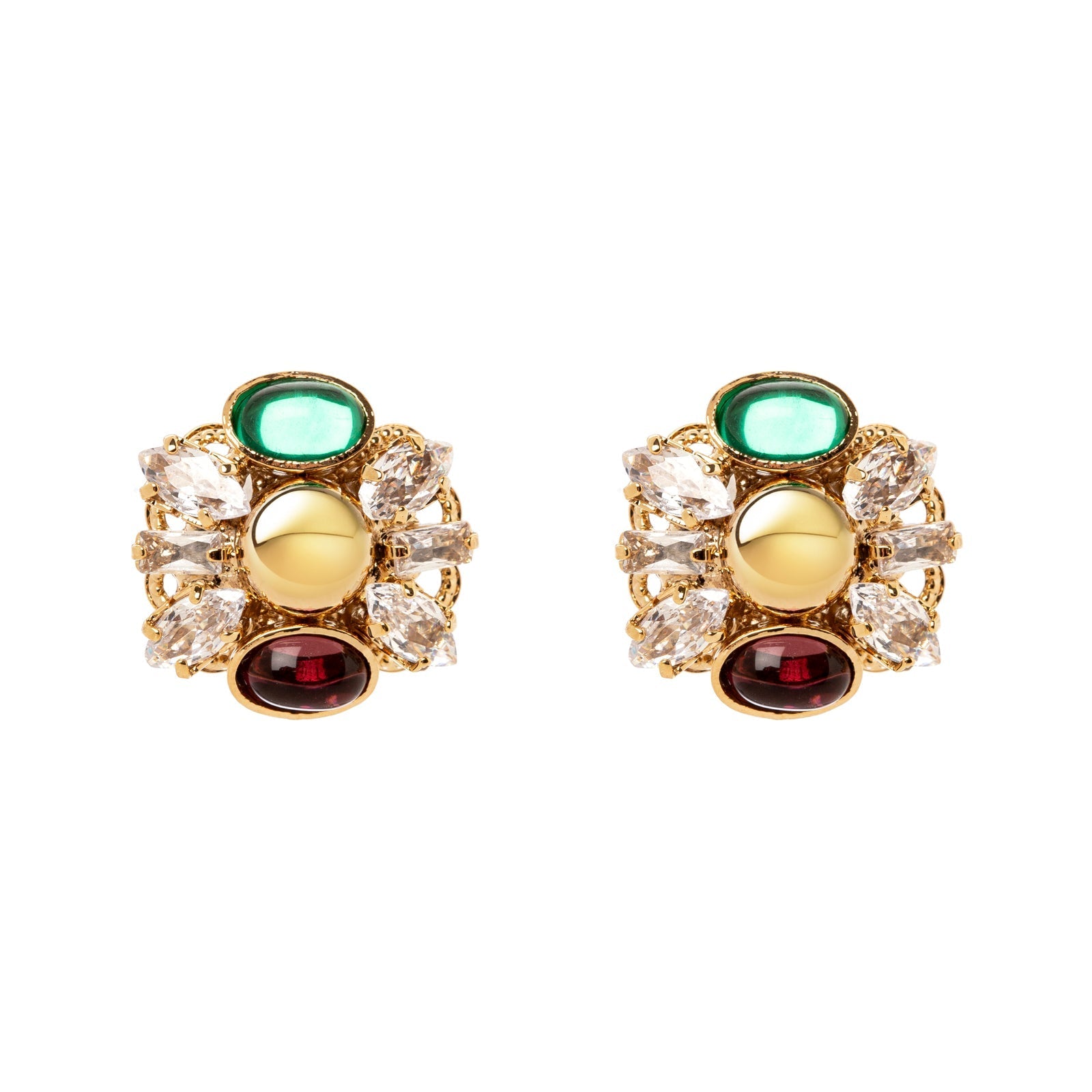 Materiali: ottone, zirconi, crisoprasio. Dimensioni 1,6 x 1,6 cm. Chiusura a farfalla.