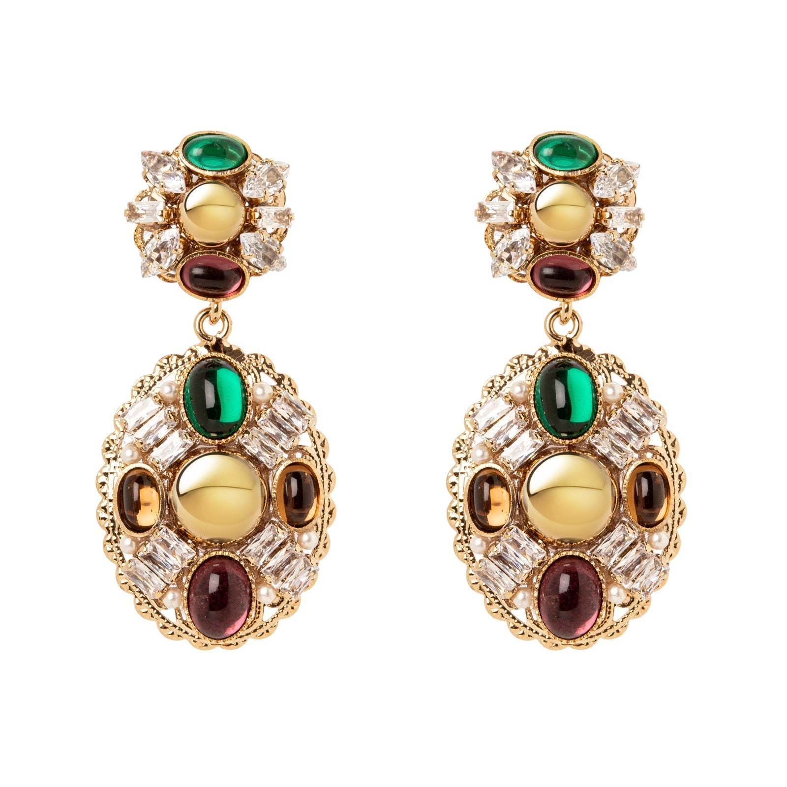 Questi orecchini catturano lo spirito di una donna dinamica che ama lo stile elegante. Design sfarzoso con un dischetto che sorregge un ovale, entrambi ornati da brillantissimi zirconi navette, baguette e cabochon che esprimono riflessi inebrianti. Una coppia di accessori perfetti per un look impegnato o per quando vuoi tu, nelle loro cromie multicolore e oro. Logo Sodini sul retro.