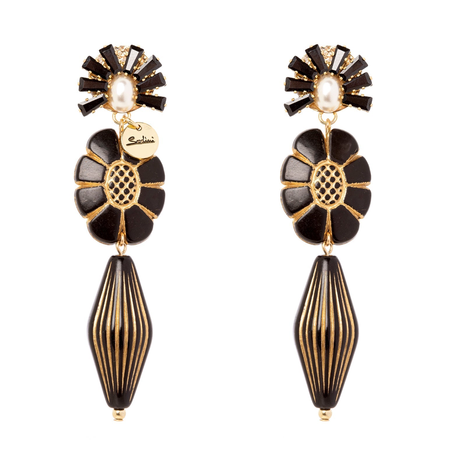 Stilosi e assolutamente classy questi orecchini aggiungono un tocco ricercato su qualsiasi mise. Design originale con piccola perla ovale e archetto di elementi geometrici che sorregge un accattivante fiore con perla centrale ed elemento a forma di fuso sottostante che seguiranno ogni tuo movimento. Una coppia di accessori perfetti in qualunque occasione, nelle loro cromie del perlaceo, nero e oro. Targhetta Sodini sul pendente.