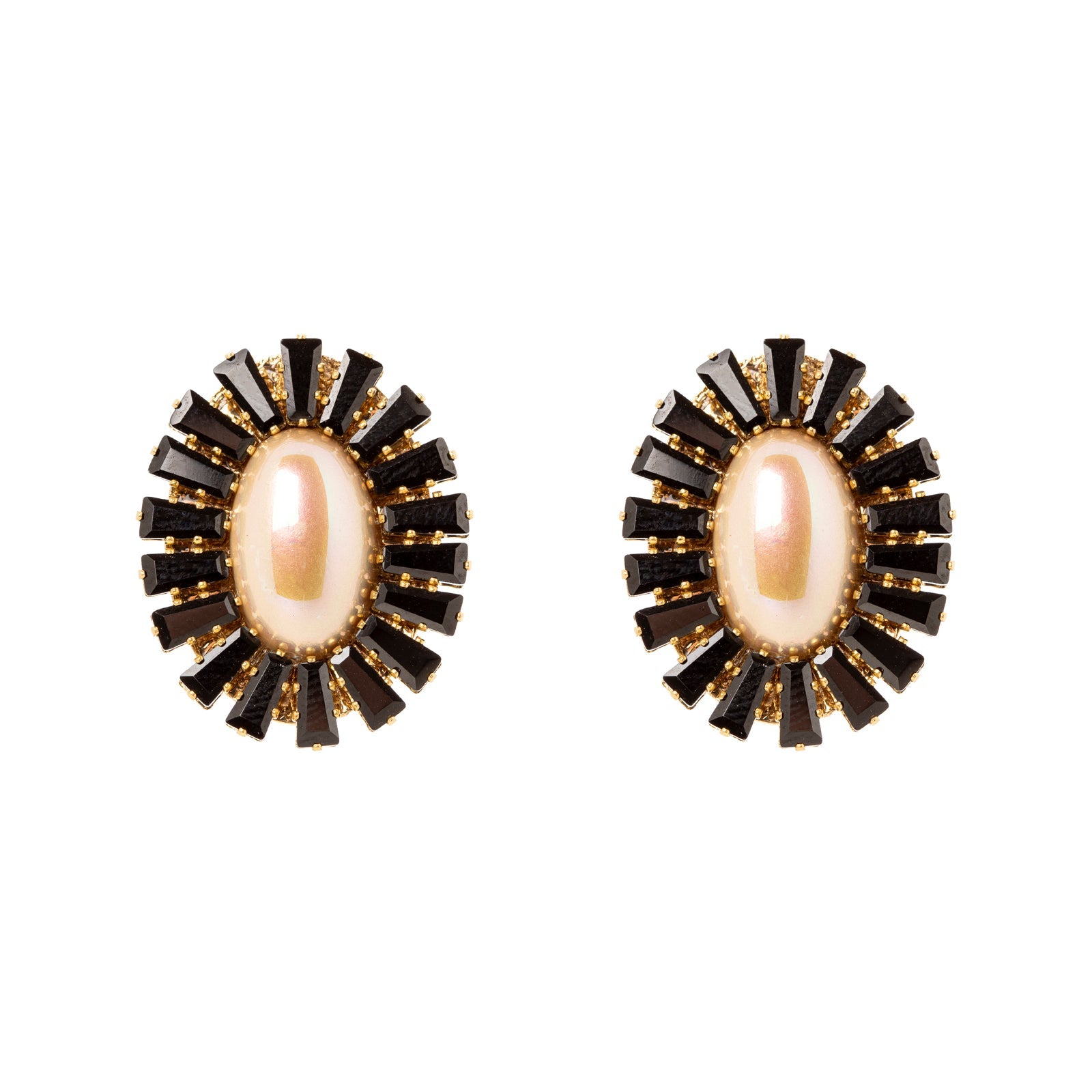 Sontuosi e assolutamente fashion questi orecchini aggiungono un tocco prezioso su qualsiasi mise. Design originale a fiore con luminosa grande perla ovale in cornice di lucidissimi elementi geometrici, per un unicum che non passa inosservato. Una coppia di accessori perfetti in qualunque occasione, nelle loro cromie del perlaceo, nero e oro. Targhetta Sodini sul retro.