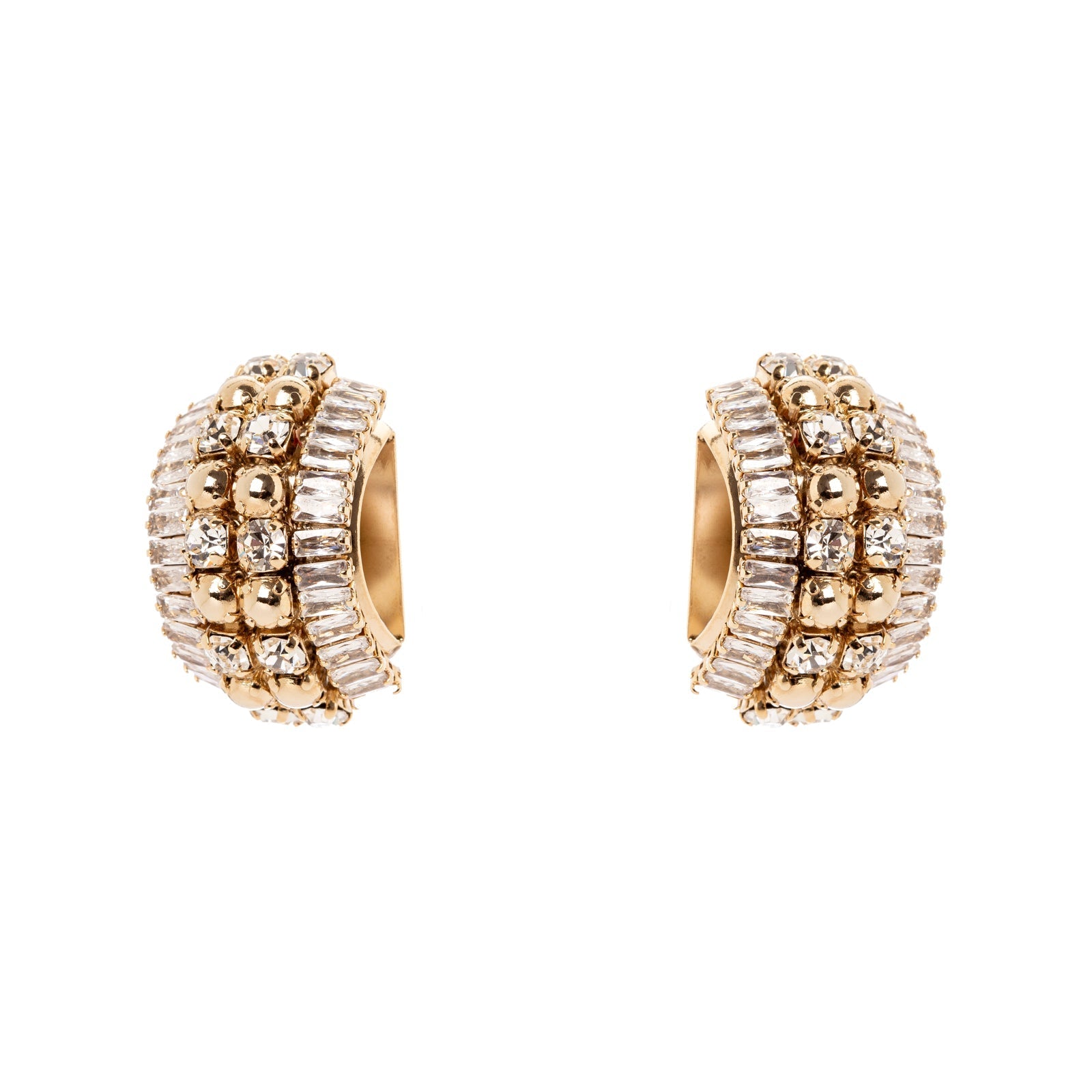 Un paio di orecchini dallo stile opulento e brioso per chi ama adornarsi con eleganza. Design a semicerchio con splendente fascia larga impreziosita da due linee di brillanti cristalli ai lati tra due linee di mini-boule e strass che insieme illuminano il viso. Una coppia di accessori perfetti con qualsiasi outfit, nelle loro cromie del bianco trasparente, e oro. Logo Sodini sul retro.