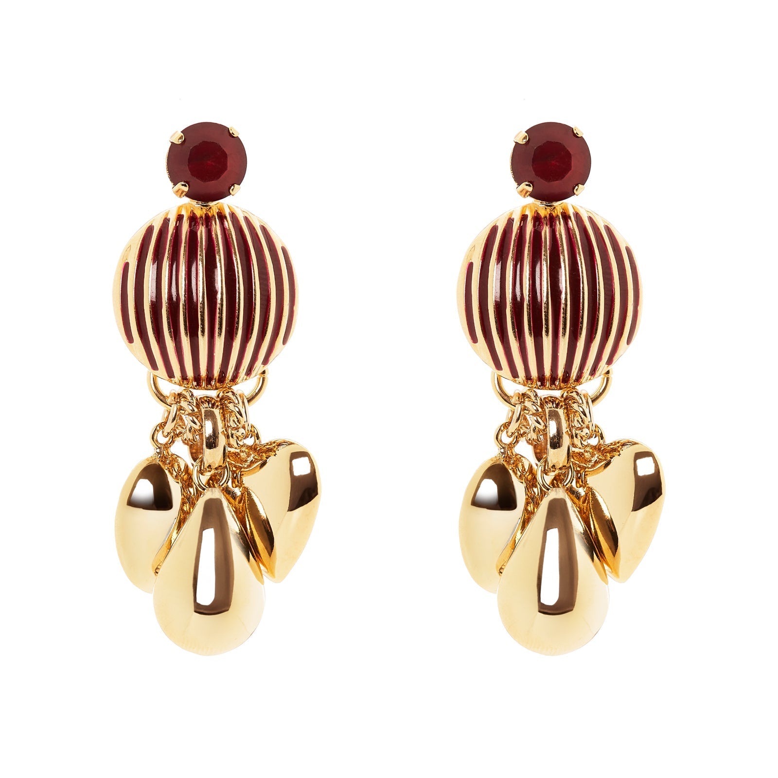 Un paio di orecchini per la donna che ama lo stile pregiato e di tendenza. Design intrigante con elemento sfaccettato congiunto a splendente semisfera dalle linee scanalate che sorregge alcuni radiosi pendenti che seguiranno ogni tuo movimento. Una coppia di accessori perfetti con qualunque outfit, in una versione dai toni del bordeaux e oro. Logo Sodini sul retro.
